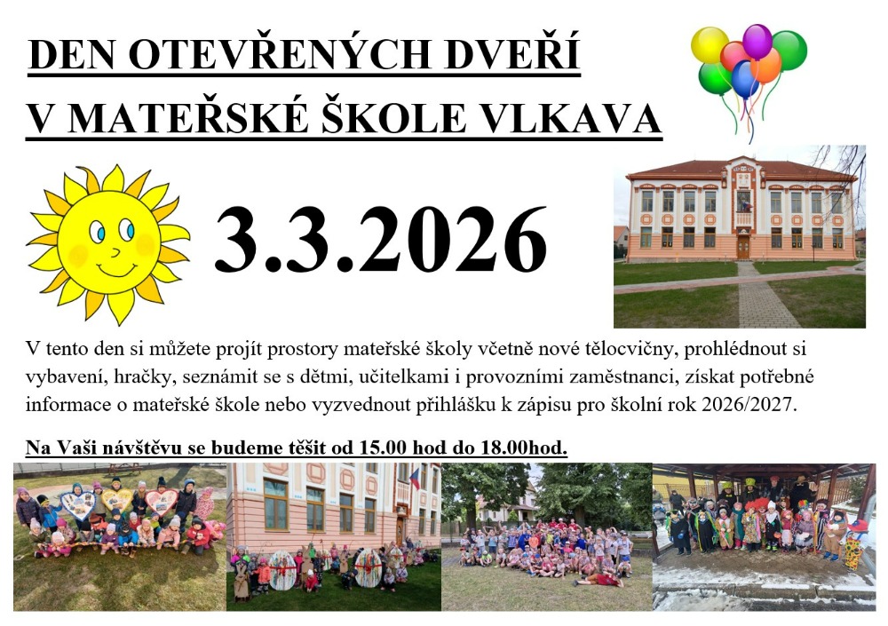 Dne 3.3.2026 se koná Den otevřených dveří v MŠ Vlkava. Můžete projít prostory mateřské školy včetně nové tělocvičny, prohlédnout si vybavení, hračky. Seznámit se s dětmi, učitelkami a provozními zaměstnanci, získat potřebné informace o mateřské škole nebo vyzvednout přihlášku na školní rok 2026/2027